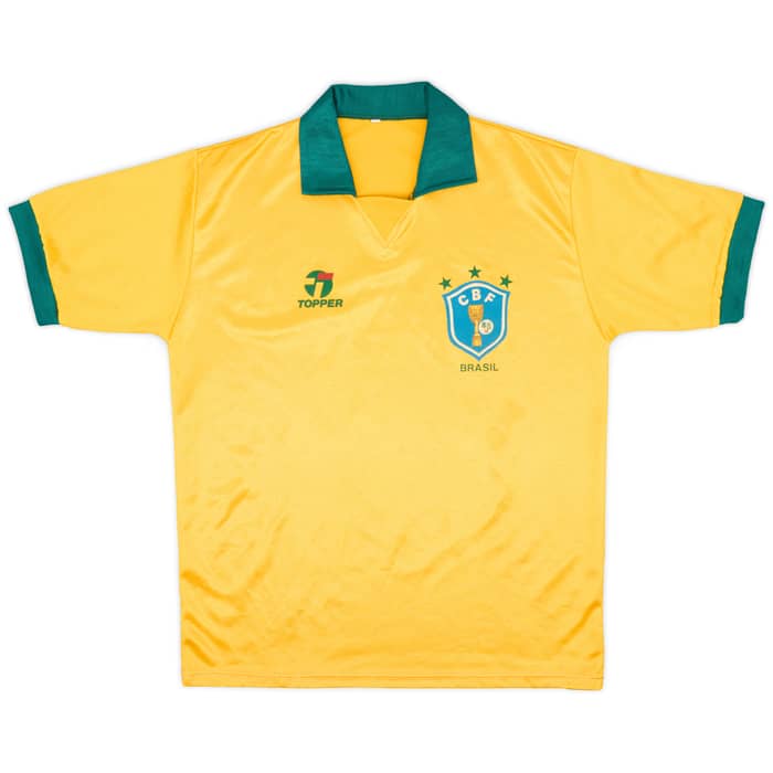Home shirt as worn by the side during the 1990 World Cup in Italy. After topping the group stage with ease and gaining the maximum points, Brazil were knocked out in the Round of 16 in an all-South American match against Argentina following a late winner by Caniggia ending it 1-0.
