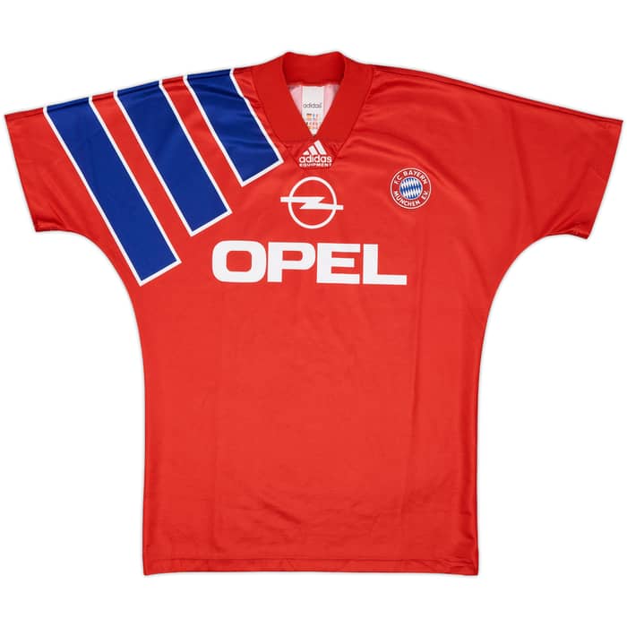 Rare classic design home shirt from the early 90s as worn when the side finished just five points above the relegation zone and were knocked out of the UEFA Cup by Danish minnows B 1903 costing coach Søren Lerby his job after only five months in charge. Die Roten would recover from an underwhelming 1991-92 season to finish second in 1992-93 under Erich Ribbeck. Bruno Labbadia would top score for Bayern in this campaign with 14 in all competitions. Particular highlights would be a 6-0 home win against Saarbrücken along with a 4-2 away win at fifth placed Bayer Leverkusen.