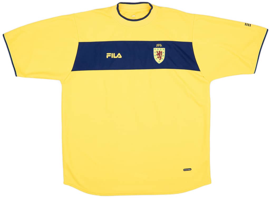 Away shirt as worn in qualification for Euro 2004 when the side were held to a shock 2-2 draw by the Faroe Islands. Scotland improved to finish runners-up in the group but were thrashed by Holland in the Play-Offs