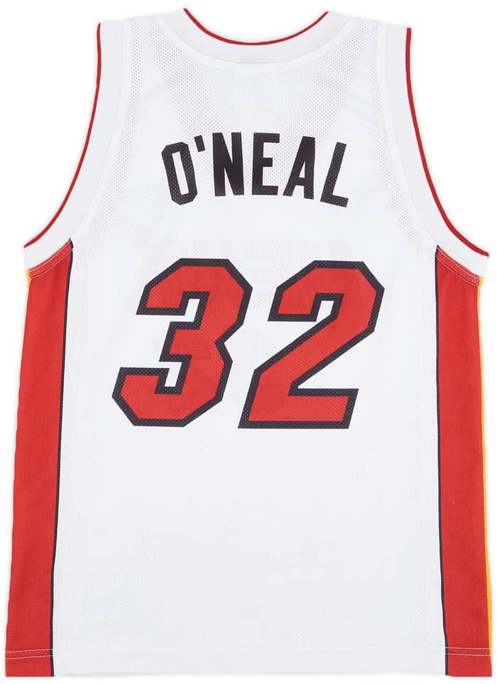 Classic Miami Heat Shaquille O'Neal #32 Champion jersey, as worn during his first season with the Heat. O'Neal is a 4-time NBA Champion (once with the Heat) and 3-time NBA Finals MVP, who was the first overall pick in the 1992 NBA Draft. He also won the 2000 regular season NBA MVP. O'Neal was named Player of the Week in his first week in the NBA, becoming the first player to ever achieve this